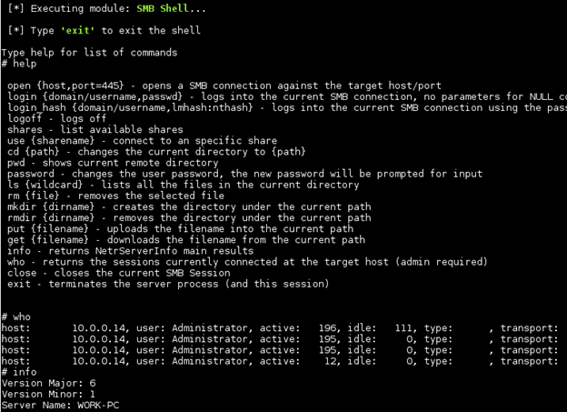A successful SMB shell is shown below with some sample commands, which show you have full-fledged SMB shell access on the target machine.