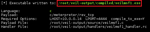 One of the modules of this category is "payload_delivery/exe_delivery" which can be used to upload an executable file and execute it on the victim machine. For this demo I am generating a Meterpreter EXE file using Veil-Evasion (part of the Veil-Framework). In the below image, you can see Veil-Evasion has generated a Meterpreter EXE along with a resource file (.RC).