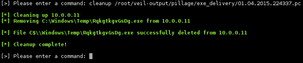 When we are done with the Meterpreter execution and want to clean up the files from the victim machine, we simply have to use the "cleanup" command from Veil-Pillage with the path to the cleanup script shown above:
