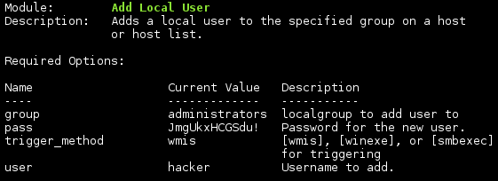 The Persistence category consists of those modules which can help you maintain access to compromised machines. One helpful task to maintain access is to create a new user account. The "persistence/add_local_user" module can perform this task easily: