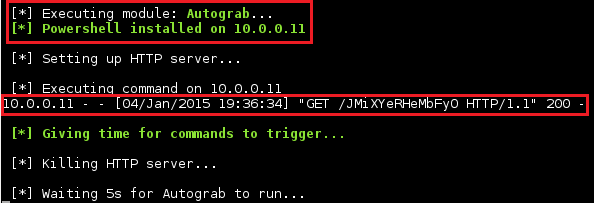 In the above screenshot, the first highlighted area shows that PowerShell has been found on the victim machine and it is being used to execute the AutoGrab module. Then the PowerShell script is downloaded and installed from the second highlighted HTTP path, which is hosted on the attacker machine by Veil-Pillage itself.