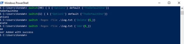 There is also a very interesting statement with is the switch one, and what's very interesting with this statement is that it supports many useful parameters like -Wildcard or -Regex on or even -File one which can be very useful inspecting a log file to search for specific information.