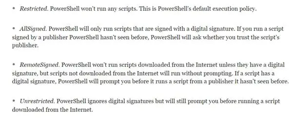 There are multiple execution policies that can be exploited. Per Microsoft's own documentation: