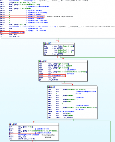 Figure 6: Warsaw trojan taking advantage of PE injection to load into the memory the infamous Horus Eyes RAT at runtime (source).