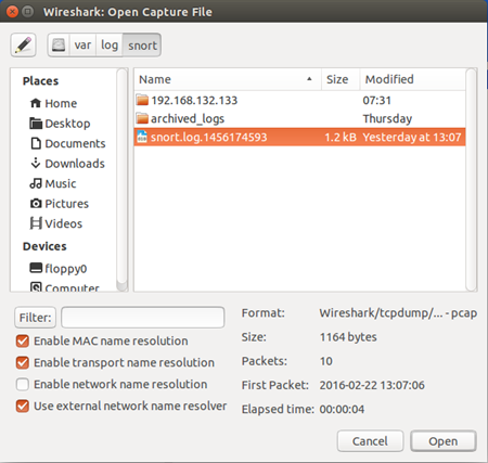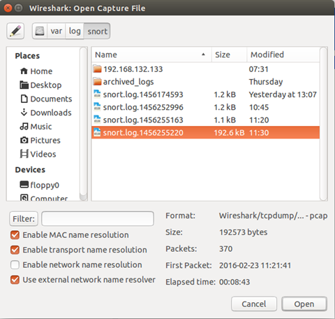 Browse to the /var/log/snort directory, select the snort.log.* file and click Open.