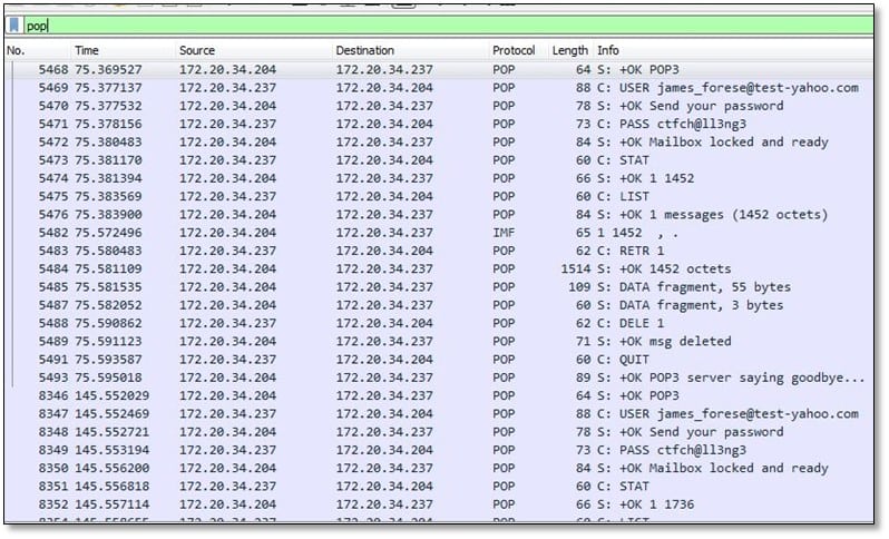 Once we have extracted the file, we loaded the pcap file in Wireshark and start investigating the traffic. Since we have to investigate the email, we have added the pop filter in Wireshark.