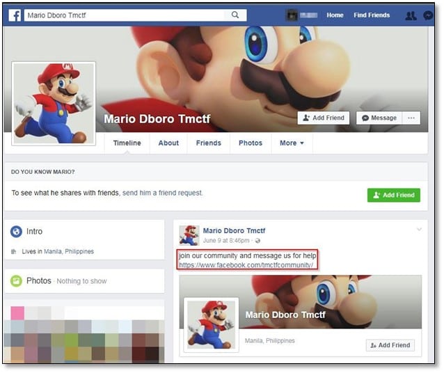 In the TCP stream, we found the From email section, and it was sent from mario_dboro@testing-my-mail.com. Once we found the email ID, we searched for it on Facebook by adding tmctf keyword as suggested in the challenge description and we found the profile, and on the wall post, we found the community page link.