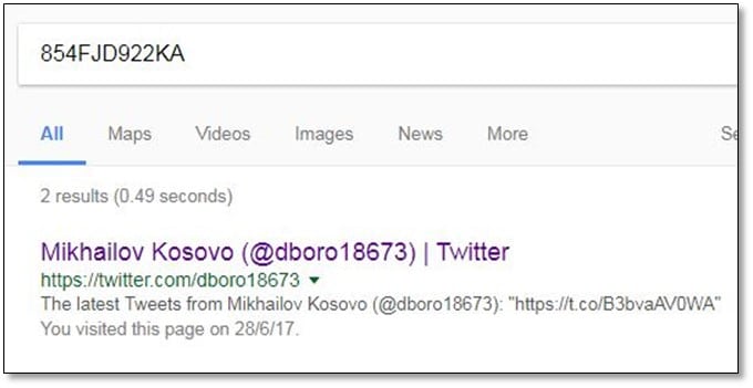 In the reply message, they provided the following "854FJD922KA" alphanumeric string, and we need to find the string on social media post. After searching it on Google, we found the Twitter link.