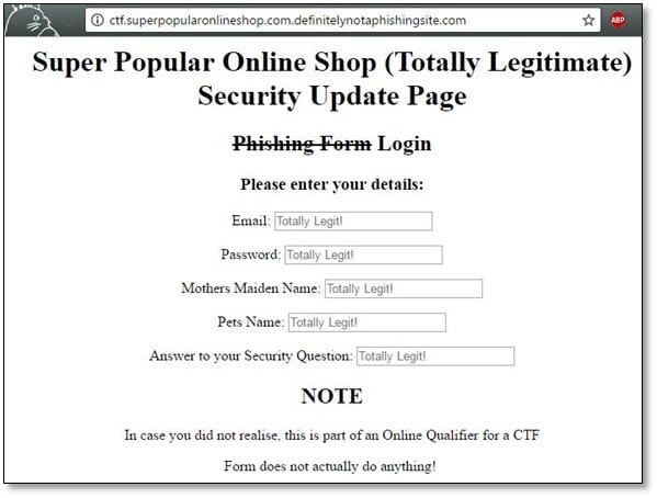 Challenge 1: Today you received an email that seemed to be from an online shopping site that you use - but when you followed the link something definitely did not seem right. It appears that the world's worst phisher must have set up the page - and has targeted you with a phishing attack!