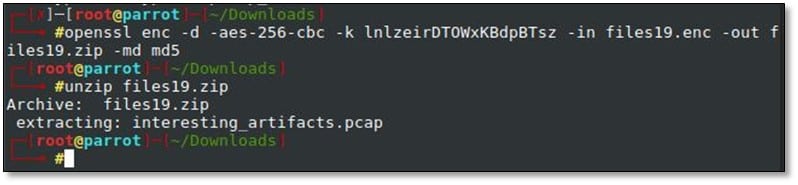 > openssl enc -d -aes-256-cbc -k lnlzeirDTOWxKBdpBTsz -in files19.enc -out files19.zip –md md5