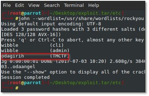 We found the password for TMCTF user who was supposed to be the flag, but it was not the password got truncated because DES uses a 56-bit key, where passwords are truncated to 8 characters and coerced into 7 bits each, so we grep the rockyou.txt file for the full password.