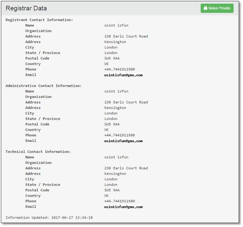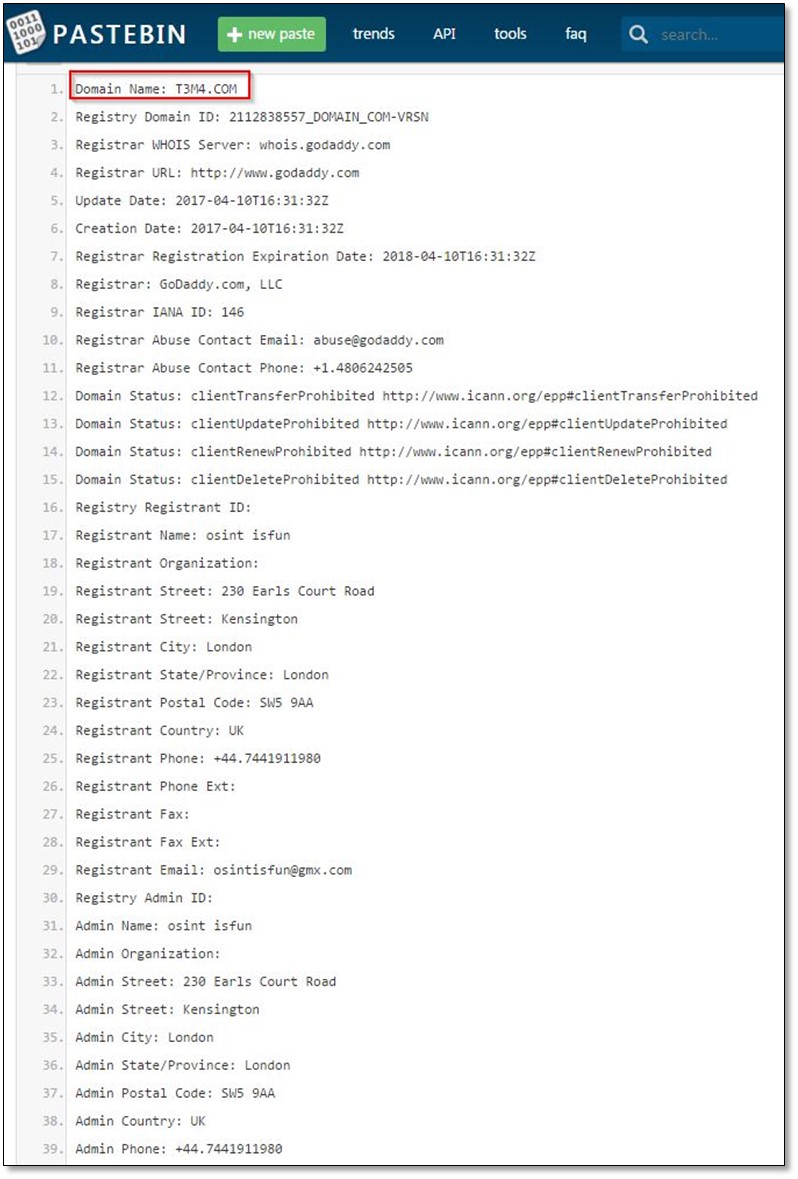 From whois, we got two information Phone and Email details we simply searched the Email osintisfun@gmx.com on Google, and we found a pastebin link on search result which contained the email address. So, we opened the link one more whois detail which contains the same phone and email address but having one more extra information which was another domain name T3M4.com.