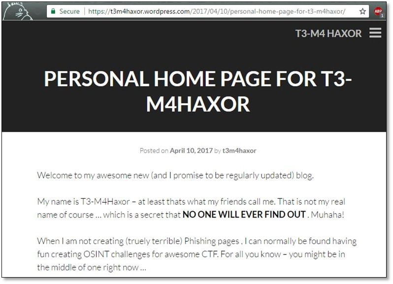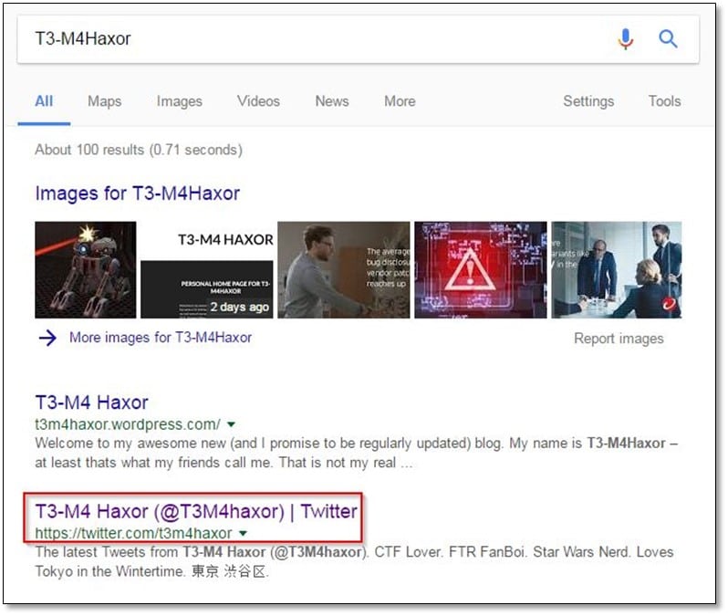 From the WordPress blog, we got the name of the phishing page creator which was T3-M4Haxor. So quickly did google search for this name and we found a twitter profile on search result