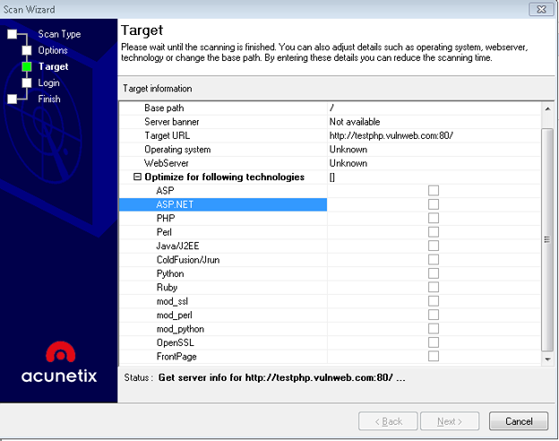 Once, the option has been selected, next step is "Optimize settings" which will crawl the whole website for further analysis. In review option, you can get all the information like host information, technologies used, policy name, etc.