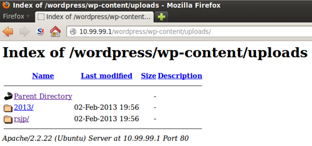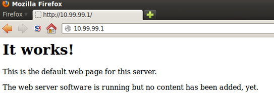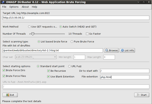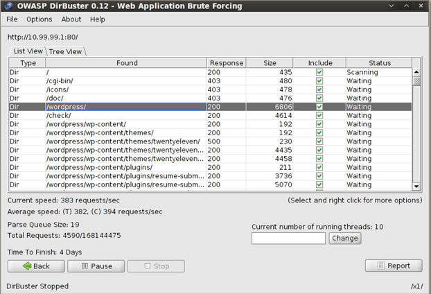 First go forward with the HTTP server on port 80. The default page is of Apache HTTP server installation with no further links in it. Run DirBuster on http://10.99.99.1/: