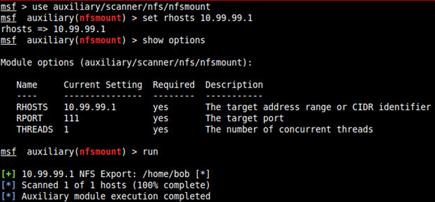 Loading metasploit and running the auxiliary module for NFS mount scanner:
