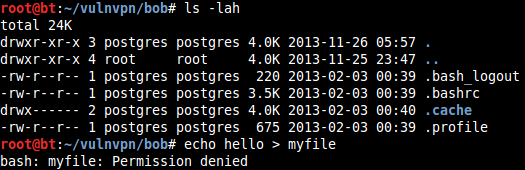 This is because "Root Squashing" is enabled on the NFS. Since the files belong to user ID 1000, we can switch user to "postgres" and create a file on NFS mount.