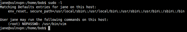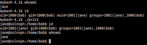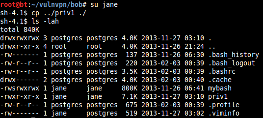 Now, getting back to the SSH shell where we escalated to jane but the UID and GID was that of bob, execute the upload executable file "priv1".