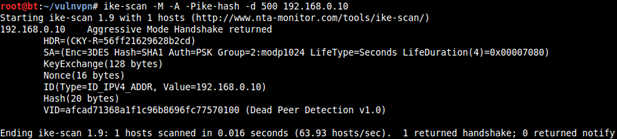 We can further test this service using the tool "ike-scan", a command-line tool that uses the IKE protocol to discover, fingerprint, and test IPSec VPN servers.