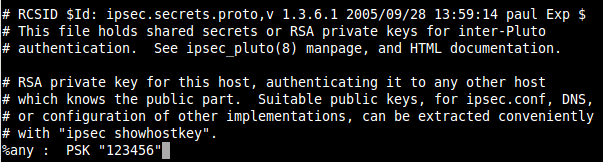 Edit /etc/ipsec.secrets and replace ENTER_PSK_HERE with 123456.