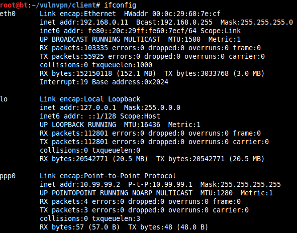 root@bt:~/vulnvpn/client# cp xl2tpd/xl2tpd.conf /etc/xl2tpd/Starting the pentest on VulnVPN