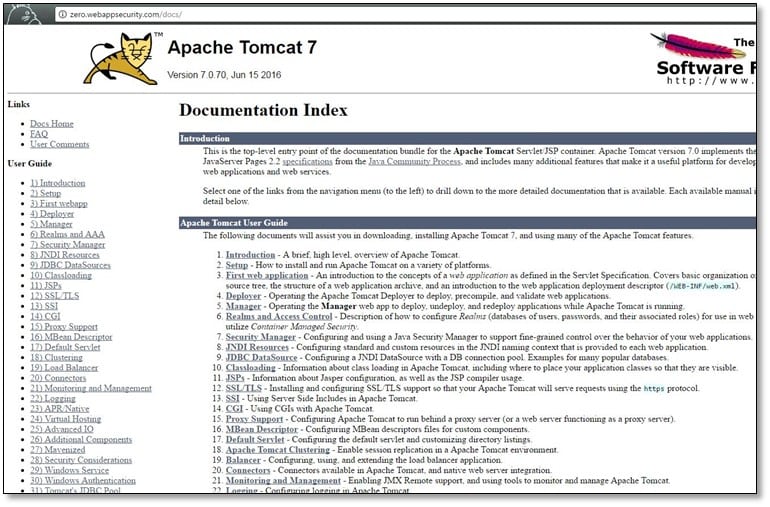 As can be seen above we have brute forced our target URL, and DirBuster has found some directory which we have not found from Google search and manual browsing. Now we will check all directories which have 200 Response for example admin we have already found from Google search, so we will look at other directories. We opened the /docs path, and we found that it contains Apache Tomcat documentation which is a default directory which comes with Tomcat during installation. So, we can report this one as an information level vulnerability from which an attacker can gather the information about running a web server with its version.
