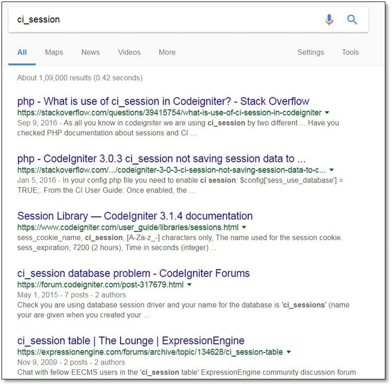 Say for example ci_session is the first time we saw and we are not able to identify the application technology, so we just search the same session id name on Google and let's see what it shows: