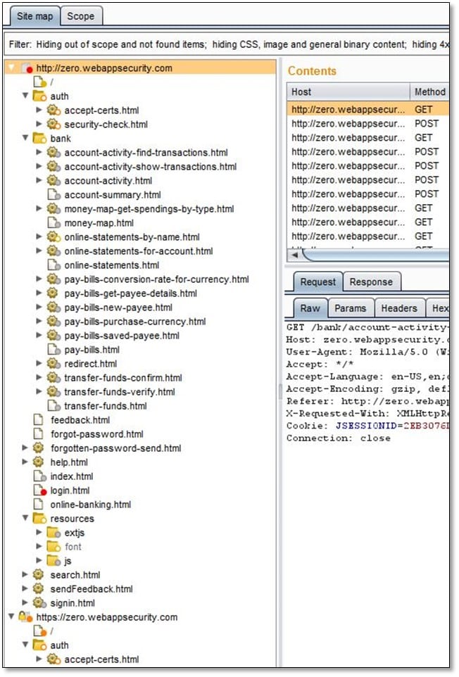 As can be seen in above image the application has Account Summary, Account Activity, Transfer Funds. Pay Bills, My Money Map and Online Statements module now go to each module and click on every link if there is any form then fill some data in the form fields and submit it. Now go to Burp Suite > sitemap section and we will be able to see all our browsed URLs are in the sitemap.
