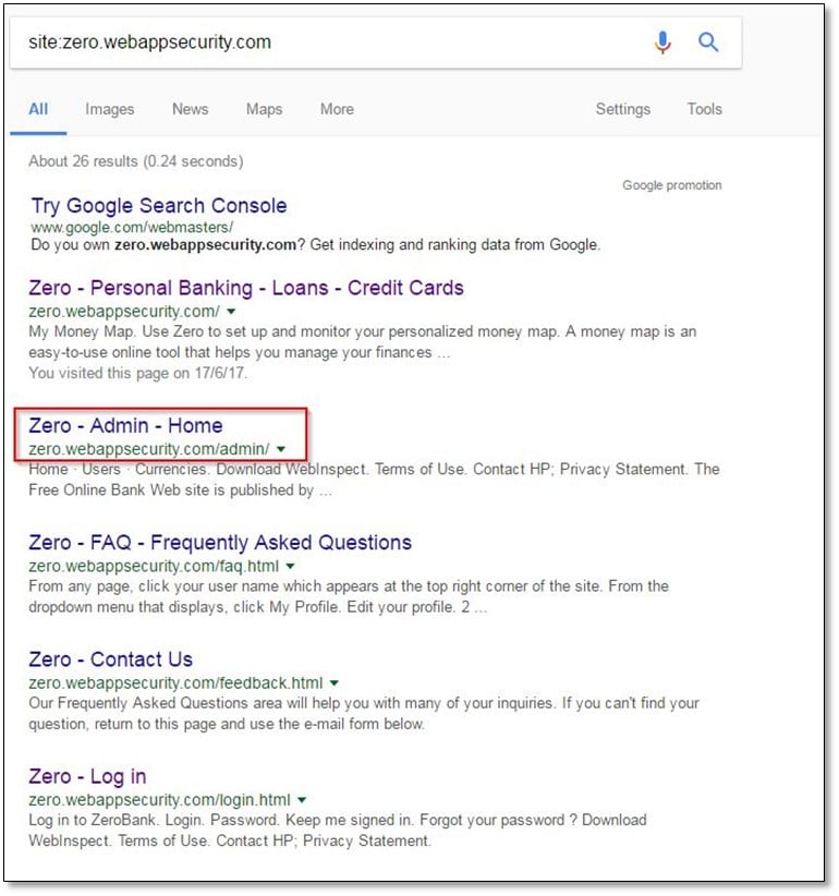 Once we are done with the application functionality browsing and crawling now, we will do Google search. This thing is requiring if the application is available on the internet otherwise skip this one. We will use Google dorks for finding cache URLs of the application by Google for this just type in site: zero.webappsecurity.com.
