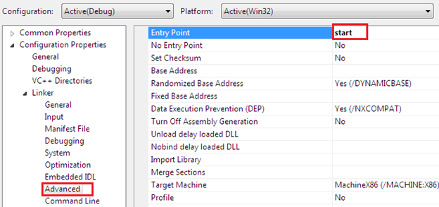 Finally configure the code entry point as the start from the Advanced option in the Linker, which determines the code execution flow. We can identify the entry point of the ASM file from the .code section.