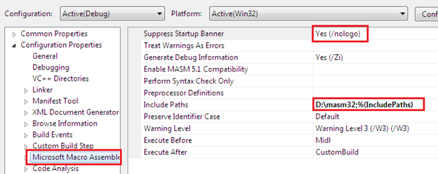 Now come to the Microsoft Macro Assembly section from the solution properties which appears the moment when we add an assembly file in solution directory, otherwise it shall be hidden. Here, set the directory name where the MASM SDK was installed earlier as follows: