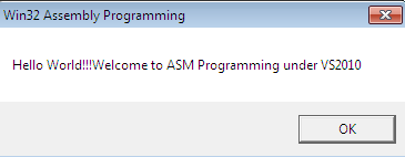 We shall demonstrate assembly programming by creating a simple Windows executable which typically shows "Hello World!" in a message box the moment it is initiated. It is very tricky to do such an implementation because Visual Studio 2010 IDE doesn't offer any explicit templates for writing assembly code like C#, VC++ and VB.NET programming languages. It in fact has an in-built option to compile or run assembly programs.