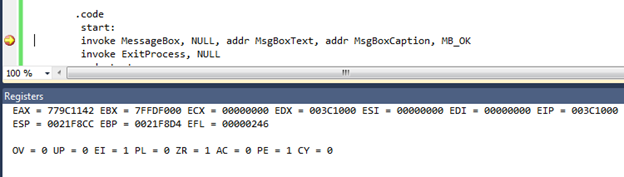 We can even debug the assembly code by inserting a breaking point as a specific location, and through the Register window in the Debug menu, we can observe all the CPU registers with corresponding flags as follows: