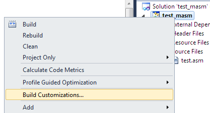 Once the test_masm of VC++ type solution is created, go to the solution explorer and right click to choose Build Customization option as follows: