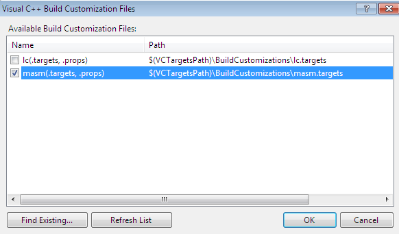 The Build Customization options open up the MASM compiler options which uncheck by default. This is the key option which must be enabled in order to edit and compile the native assembly code file.