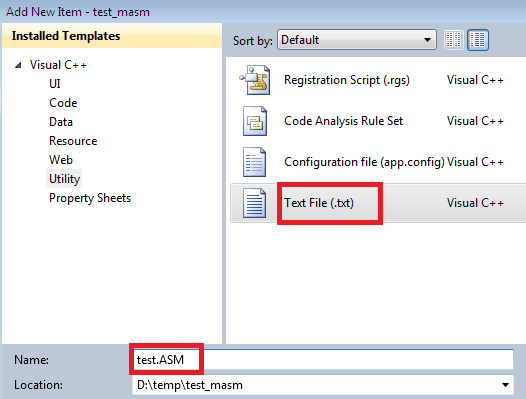 Now, a blank text.asm file is added to our test_masm solution. Open it and paste the following assembly code, which is responsible for displaying a message box, as follows: