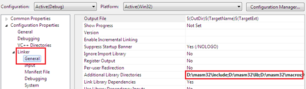 Successful execution of an assembly code file with Visual Studio IDE depends on an external library file, which will be available from MASM SDK. Hence, choose project Properties by right clicking it from the solution explorer. Here, choose General by expanding Linker and in the Additional Library Directories, insert the path of include, lib and macros directories as follows: