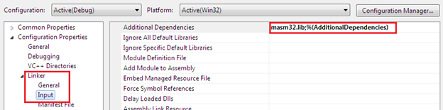 Next, come to the Input section in the Linker and mention the reference of masm32.lib file as additional dependencies: