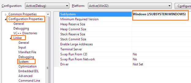 Now, come to System from the Linker and set Windows in the subsystem section as follows: