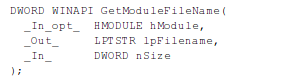 The next method is using GetModuleFileName, which retrieves the fully qualified path for the file that contains the specified module [3]. The function syntax can be seen below. The function accepts three parameters, the hModule, the lpFilename and the nSize. The hModule contains a pointer to the requested module whose path we would like to obtain. If the parameter is NULL (as it is in our case), then the function will retrieve the path of the current executable instead. The lpFilename parameter is a pointer to a buffer, where the module/executable path will be stored; the buffer size must be larger than the size of the returned path if we want the function to succeed. The nSize parameter specifies the size of the lpFilename buffer, which must exceed the length of the returned path.