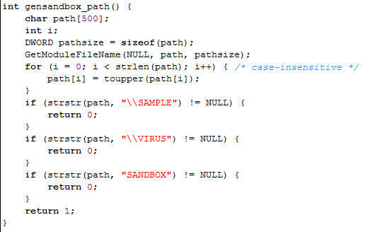 The actual code that checks whether the code is being executed in a debugger can be seen below. The code first reserves some space on the stack for buffer path and integer i. Then it calls the GetModuleFileName to get the path of the current executable – notice that the first parameter is NULL? The path of the executable is stored in the path buffer, which is then transformed into upper-case letters. Then the strstr function is used to check whether the retrieved path contains strings SAMPLE, VIRUS or SANDBOX and returns 0, which signifies the function is being executed inside a sandbox. Otherwise, 1 is returned, which signifies that the program is not being run in a sandbox: more specifically, that the path of the currently executing executable doesn't contain the strings SAMPLE, VIRUS or SANDBOX.
