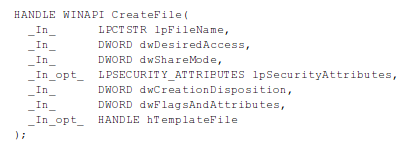 The lpFileName contains the name of the file or device to be created or opened, while the dwDesiredAccess contains a flag requesting certain access to the file/device: read (GENERIC_READ), write (GENERIC_WRITE), both (GENERIC_READ | GENERIC_WRITE) or zero. The dwShareMode specifies the requested sharing mode, which can be read (FILE_SHARE_READ), write (FILE_SHARE_WRITE), delete (FILE_SHARE_DELETE) or zero. The lpSecurityAttributes contains a pointer to the SECURITY_ATTRIBUTES structure, which determines whether the returned handle can be inherited by child processes – if the value is set to NULL, then the returned handle cannot be inherited by any child processes. The dwCreationDisposition specifies an action to perform on a file, which can be: create a file (CREATE_ALWAYS), create a new file if it doesn't exist (CREATE_NEW), open a file (OPEN_ALWAYS), open a file if exists (OPEN_EXISTING), or open a file if exists and truncate it to zero bytes (TRUNCATE_EXISTING). The dwFlagsAndAttributes specify the file attributes and flags, while the hTemplateFile has a valid handle to the template file (can be set to NULL). If the function call to CreateFile succeeds, the function returns an open handle to the specified file. Otherwise it returns INVALID_HANDLE_VALUE.