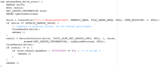 The code that tries to determine whether the program is being executed in a sandbox can be seen below. The function first reserves some space on the stack for local variables. Then it calls the CreateFile to read the \.PhysicalDrive0 device only if it exists. If the device exists, the CreateFile will return the open handle to the opened device, otherwise the INVALID_HANDLE_VALUE will be returned. If the CreateFile returns INVALID_HANDLE_VALUE, the file will be closed and the function will return 1 to signify that the program is not being executed in a sandbox. If the device exists, the DeviceIoControl will be called to send the IOCTL_DISK_GET_LENGTH_INFO action to the device to get the length of the device. If the length of the device has been successfully obtained, the result should be a nonzero number. In such case, the actual size of the device is compared to 50GB. If the size of the device is smaller than 50GB, a value 0 is returned to signify the program is being run under a sandbox.