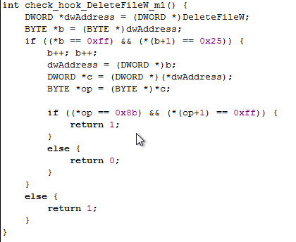 The hooks.c source code contains the following function, which detects whether the DeleteFileW has been hooked. The code first stores the address of the DeleteFileW function into the dwAddress variable. Then it checks whether the first two bytes of the function are 0xff25, which represent the assembly instruction for jump instruction. Usually the functions create a new stack frame upon being called, but the jmp instruction at the beginning of a function clearly indicates the function has been hooked. If the first instruction is jmp, we're storing the address to jump to into the dwAddress and checking whether the address starts with 0x8bff. In that is the case, the jmp actually jumps to a valid instruction in the kernel code; otherwise the address is invalid and we can conclude the function has been hooked and jmp will jump to a hooked procedure.