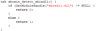 The function below calls the GetModuleHandle by passing it the "sbiedll.dll" module name in order to obtain its handle. If the function returns a handle, the current program was started inside the Sandboxie environment.