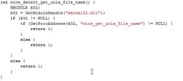 The code to detect a Wine environment is first getting a handle to the kernel32.dll and then calling the GetProcAddress to retrieve the address of the wine_get_unix_file_name exported function/variable specified in the kernel32.dll. If the function succeeds, it will return the address of the exported function, otherwise it will return NULL.