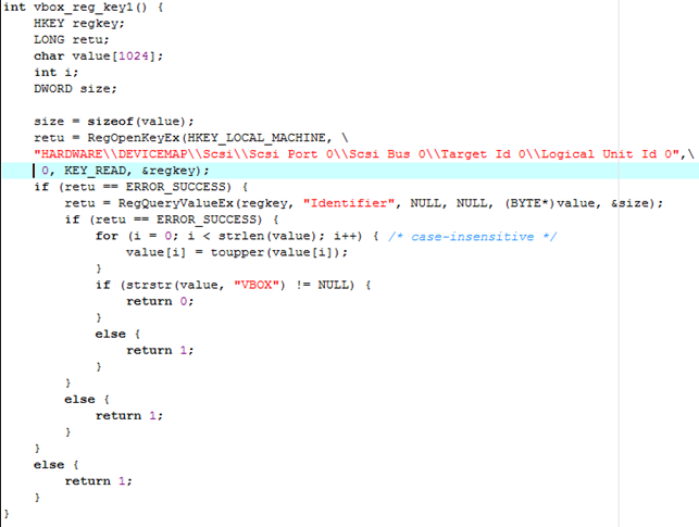 The code below uses the RegOpenKeyEx function to open the registry key seen on the picture below. If the function finds the specified registry entry, it will return ERROR_SUCCESS, otherwise a value of nonzero will be returned. Afterwards the type and data of "Identifier" registry key is retrieved: the value is stored in the lpData parameter. The retrieved data is then converted to uppercase letters and compared to the VBOX string. The value represents the SCSI disk name, which contains VBOX when the program is running under VirtualBox, otherwise it is not.