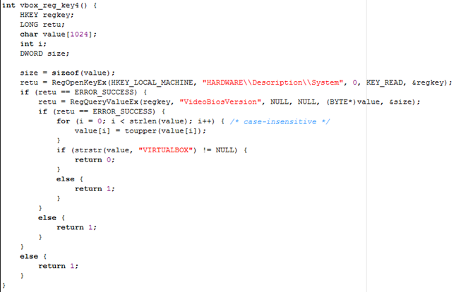 The method below is actually very similar to the method above, except that we're checking whether the SystemBiosVersion value contains the string VBOX, in which case the program is running under VirtualBox.