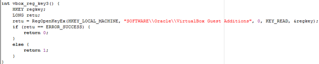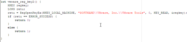 The function below checks whether the "Vmware Tools" registry key exists in a registry, which means the system is running under VMWare.