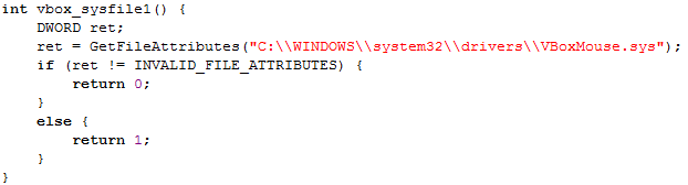 The code below checks whether the mouse driver for the VirtualBox exists: C:WINDOWSsystem32driversVBoxMouse.sys. If the file exists, the program is running in a VirtualBox.